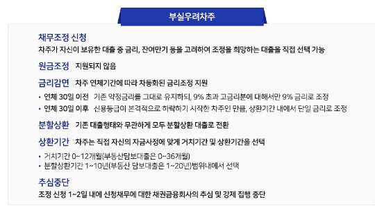 - 부실우려차주 재조정: 부실우려차주가 90일 이상 채무조정안을 이행하지 못하는 경우, 부실차주 지원으로 재조정이 가능합니다.